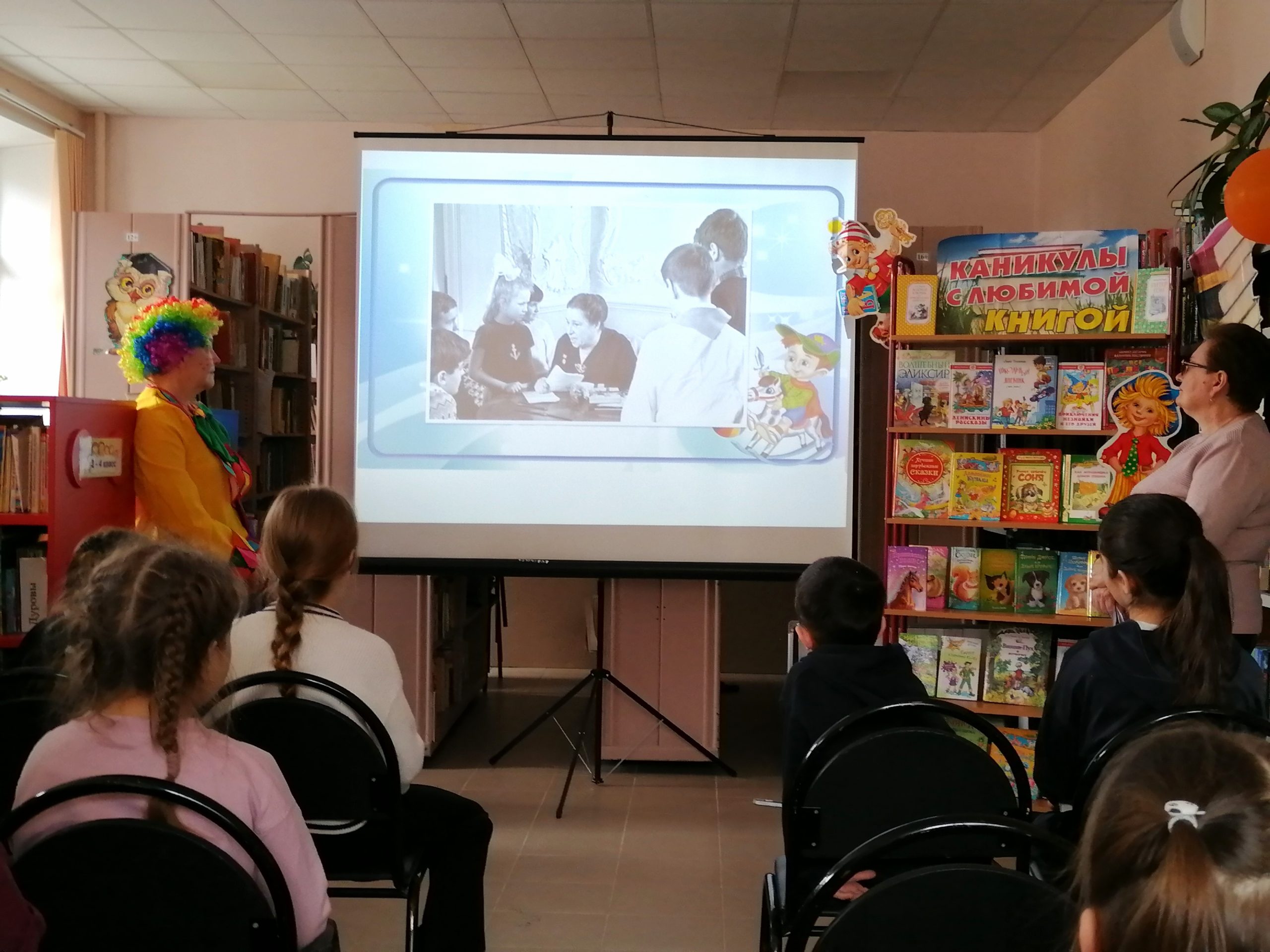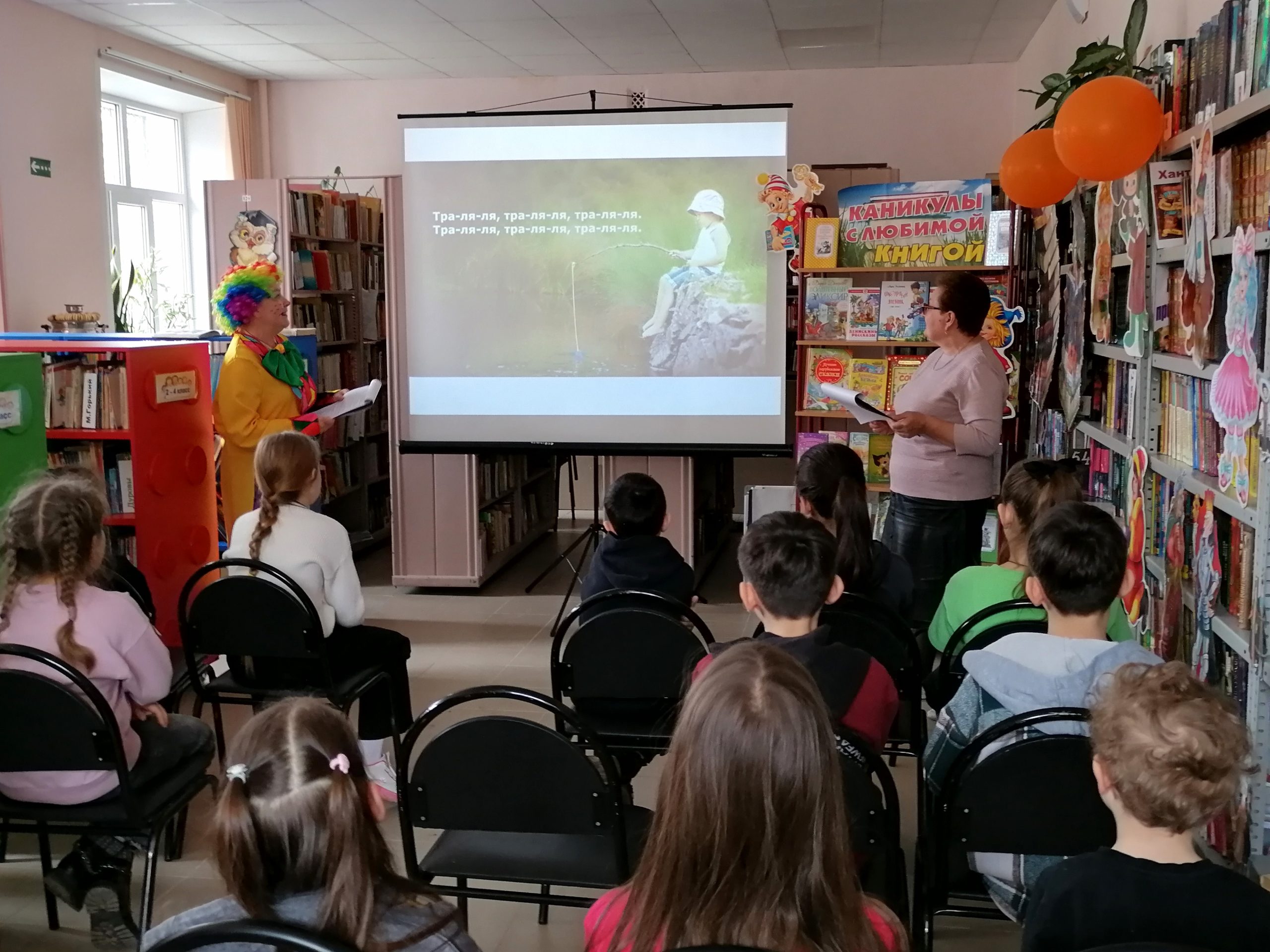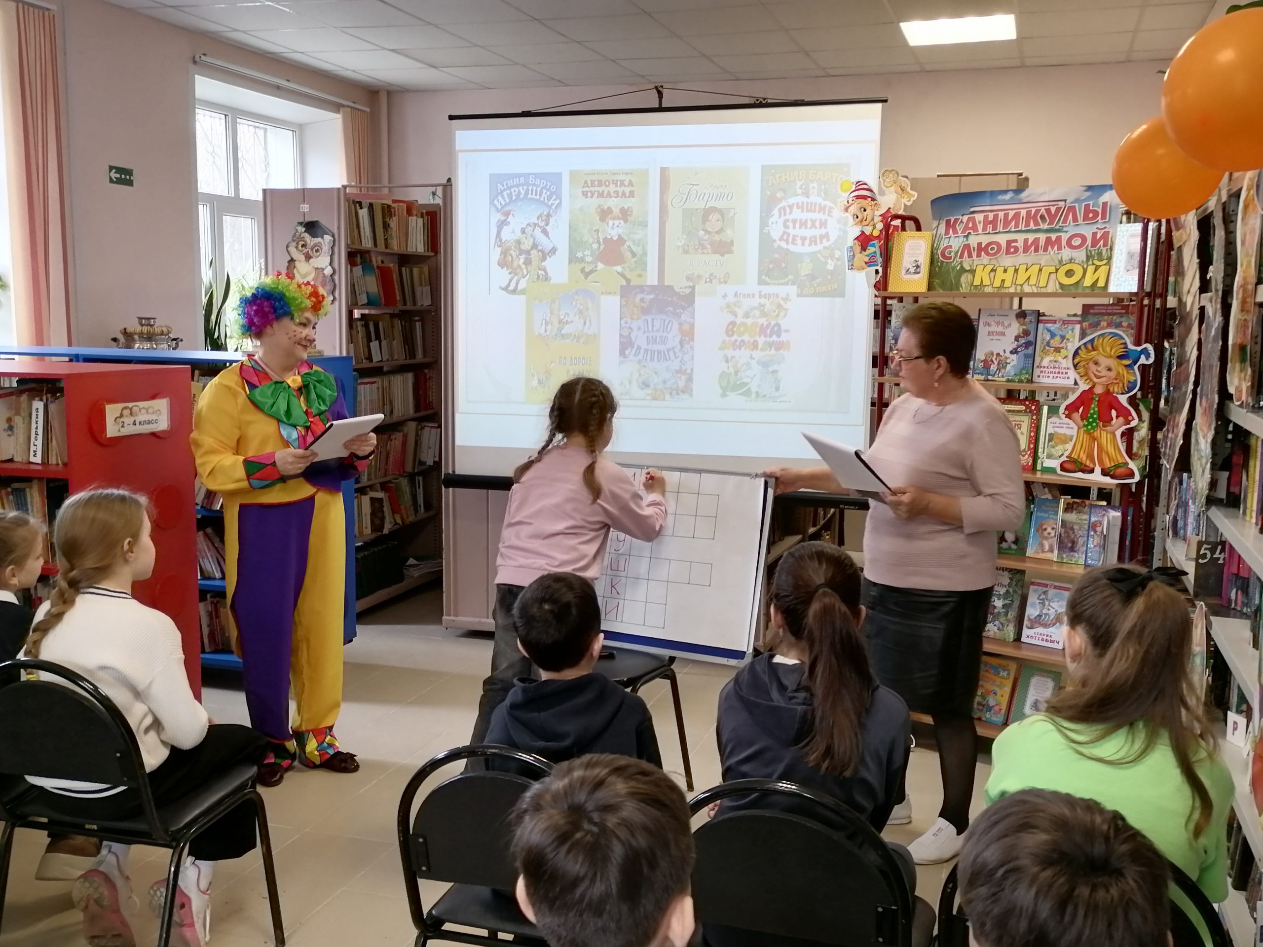Но на этом приключения не закончились! Вместе с Клоуном дети разгадывали загадки-кроссворды, участвовали в интерактивной викторине, читали вслух любимые стихотворения и делали весёлую физкультминутку. А в завершение праздника все вместе посмотрели мультфильмы, снятые по стихам А. Барто и спели задорную песенку «Любитель-рыболов».